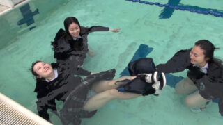 ウェット&メッシー サバイバル水泳上級編 3年生からは冬制服指定です。夏場は着ないので今のうちに!!冬のブレザー姿で着水します。プールに入った感想は「すごい重い…」「意外と浮く」3人ともスカートがクラゲみたいになっていました。 2025.09.07 ウェット&メッシー