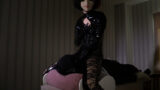 金融不況の中、A社が倒産、その社長がヤミ金の代償として奴○市場に売り出され、元A社社長秘書綾乃が元社長を落札し奴○調○所に連行し地獄の奴○改造調○を開始した。綾乃は、先輩奴○(1号)の床掃除の点検を行い、不備を見つけ元社長(2号)の目の前でギロチン台に縛り、鞭打ち折○を行い、2号に命令違反の恐ろしさを見せつけた。2号はブーツ舐めを拒否したので、胡坐縛りにしてブーツ責め、圧迫責めで折○し、檻に監○した。翌日、1・2号は逃亡した。2人を吊り、主犯の2号には竹刀、ビンタ、強烈な蹴り拷○で、1号には一本鞭で折○し改めて忠誠を誓わせた。2人を檻で飼い、2号を椅子、1号に足を舐めさせた。餌は床に零しブーツで与えた。人間馬の訓練は1.2号別々に騎乗し、馬追い訓練を楽しんだ。1号が潰れたので1号を逆海老縛り吊り責めで拷○し、ローソク責め、人間ブランコにして楽しんだ。その後、人間便器、ペニバン責め、人間ブランコに調○した。
